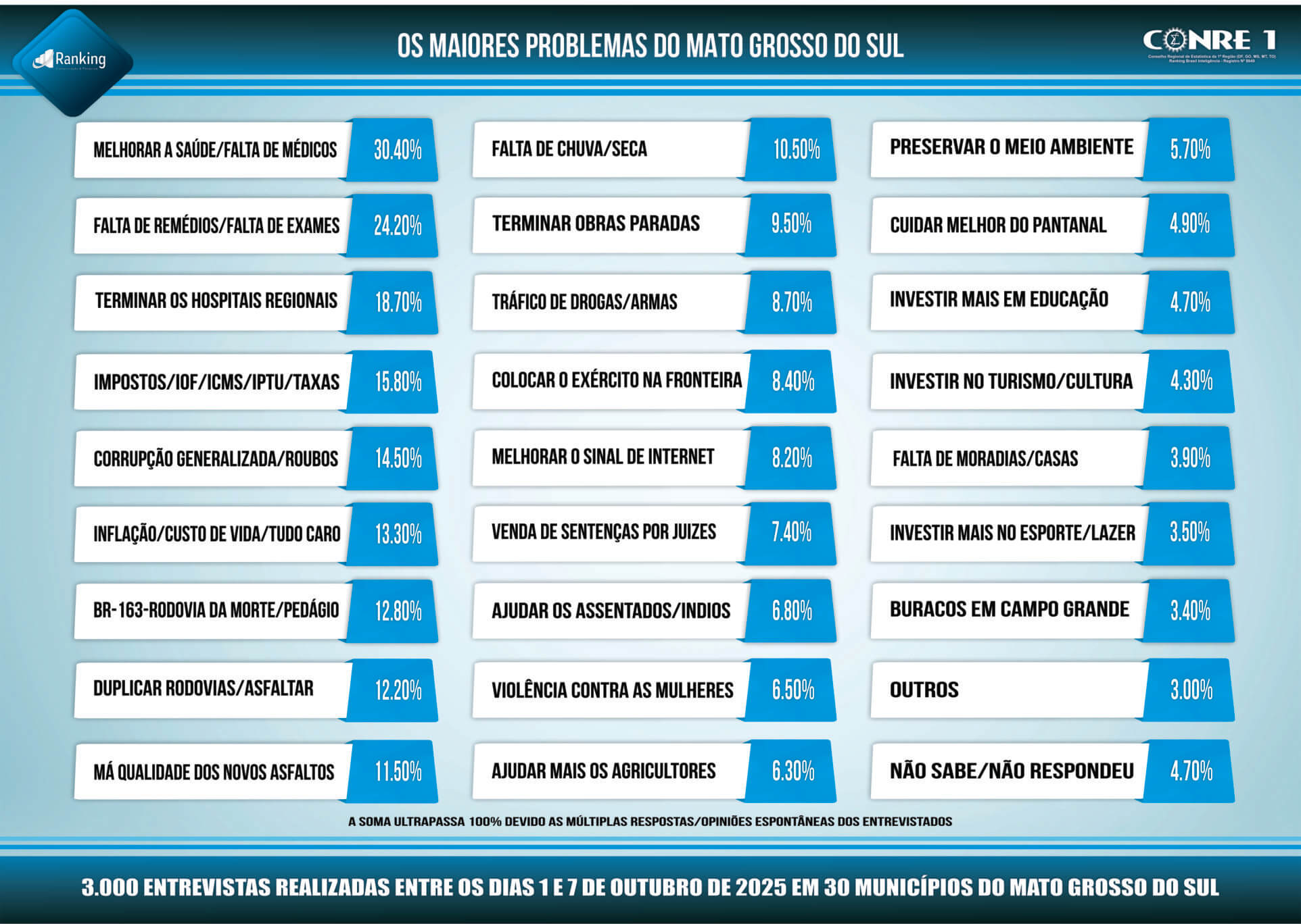 Por encomenda da Rede de Rádios Top FM, pesquisa realizada pelo Instituto Ranking Brasil Inteligência, de 1º a 7 de outubro deste ano, junto a 3 mil moradores com 16 anos ou mais de idade, em 30 municípios de Mato Grosso do Sul, com intervalo de confiança de 95% e margem de erro de 1,8 ponto percentual para mais ou para menos, traz os maiores problemas do Estado.